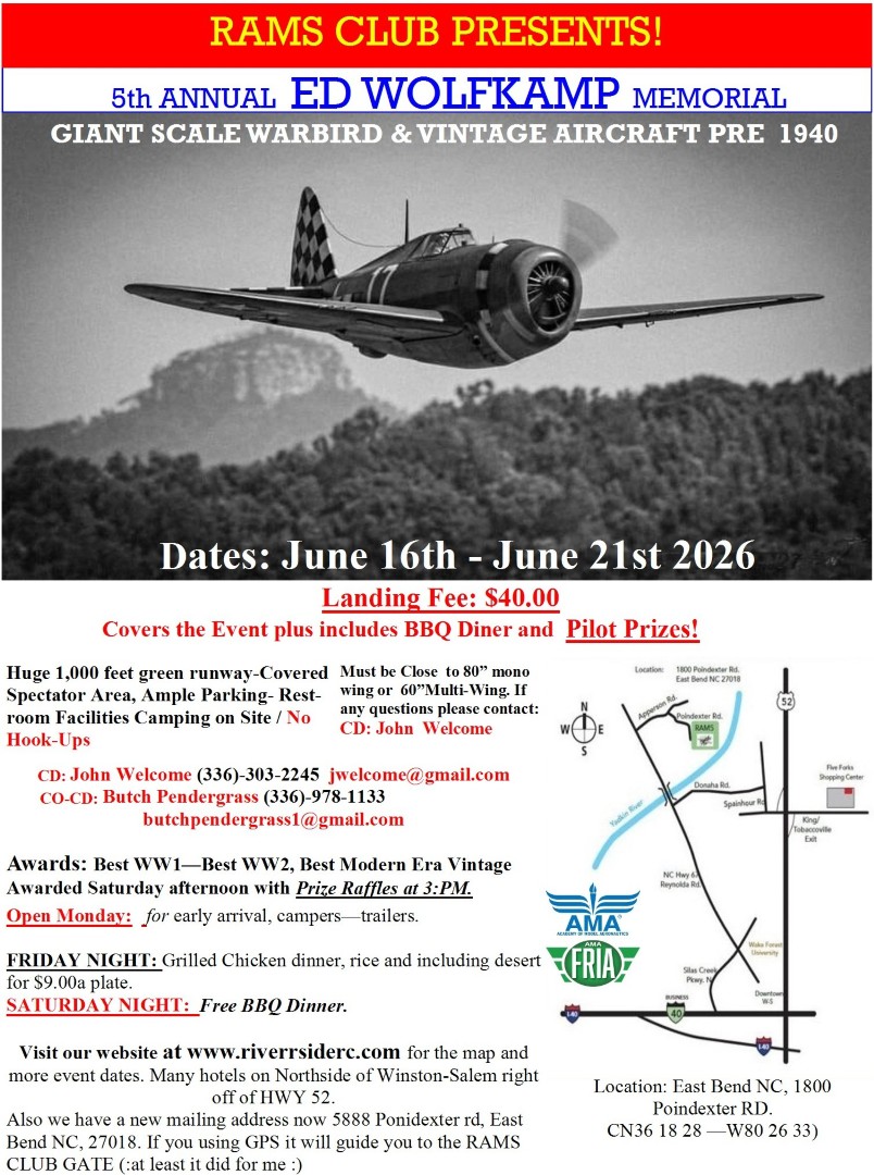 This webpage contains known event dates for RC flying clubs in the Central North Carolina area. Whenever possible, flyers with event details, club locations and contact information will also be made available here. Do you have a club event you want others to know about? Great! Just let me know and I will be more than happy to include it in my regional flying events calendar! Just send your information to: B&G Calendar. Changes to this calendar of events do occur from time to time, so please check back often. The events and flyers below are all those I have received, or could find info for as of 19 April 2026.